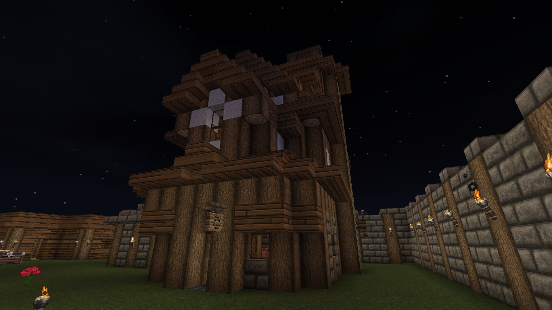 Inside, chatter and laughter fill the air as mugs clink and stories grow taller by the fire. Though humble in size, the Dunken Mole is rich in charm — a true Skyrim-style Minecraft tavern where comfort, ale, and friendship come easy.