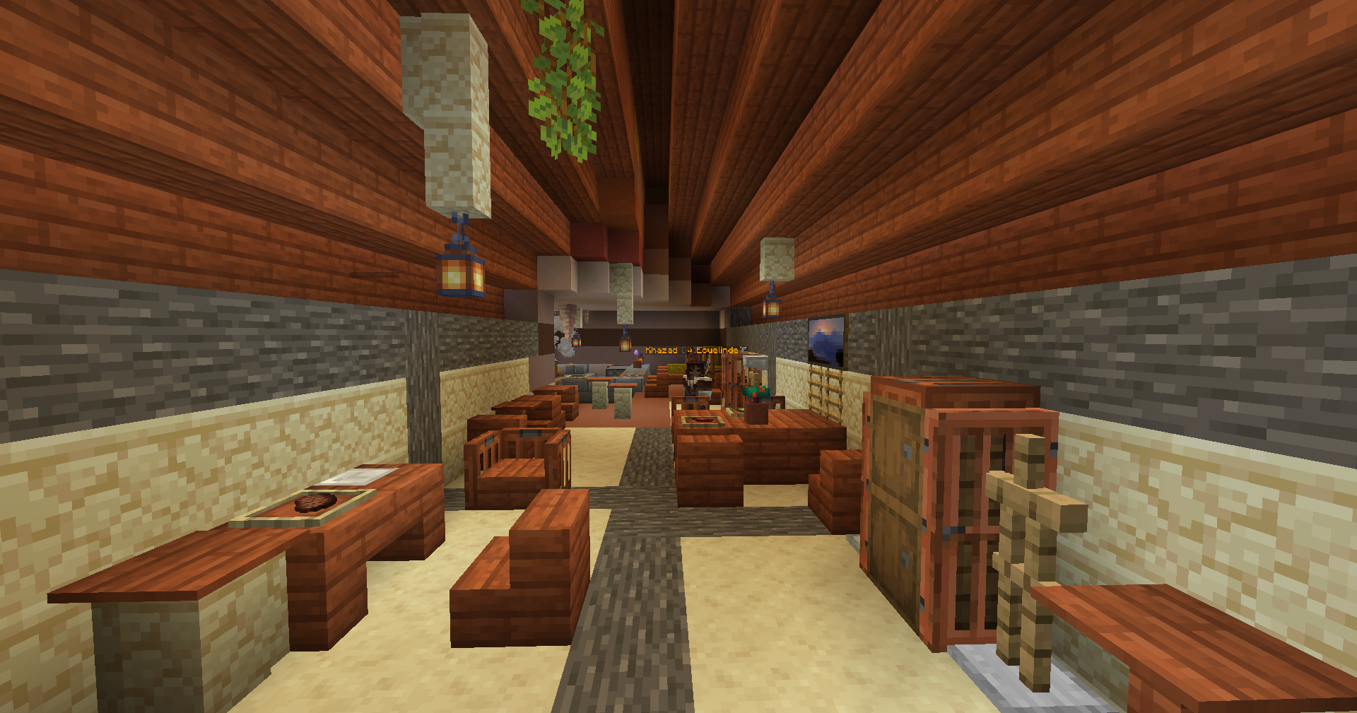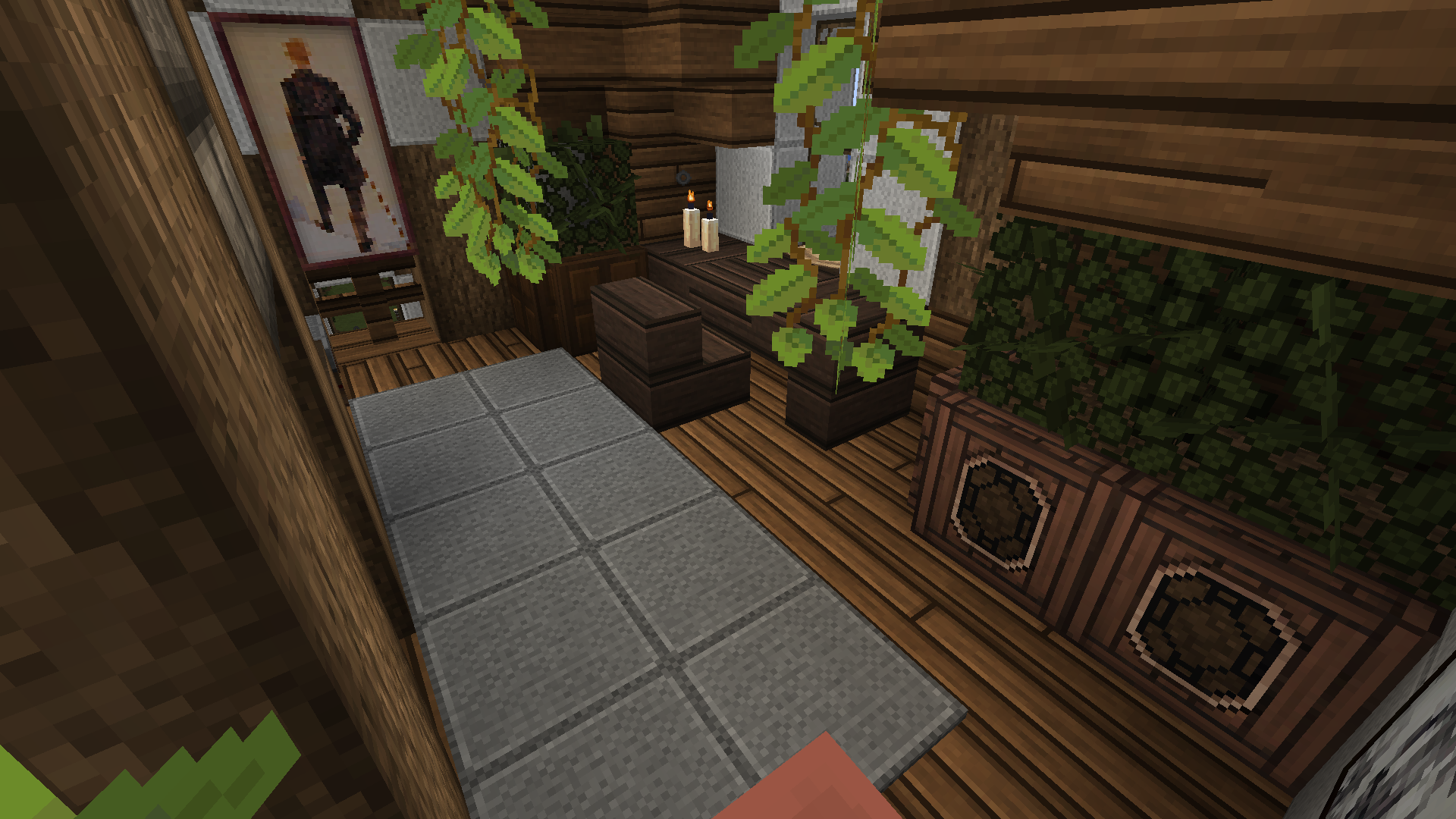 The Squeaky Frog Inn is a cozy, nature-filled tavern nestled deep in the swamp — a hidden gem straight out of a Skyrim-inspired Minecraft build. Its mossy walls and twisting vines blend seamlessly with the wetlands around it, as if the inn itself had grown from the earth. Inside, the air is warm and fragrant with damp wood and blooming lilies, while frogs croak softly from the massive terrarium.